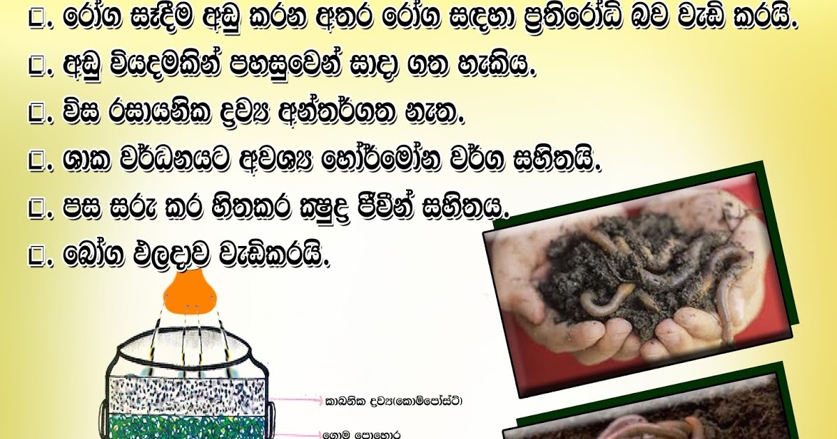 3. විෂ බවින් යුතු රසායනික පොහොර වෙනුවට කාබනික පොහොර ආදේශකයක් ලෙස භාවිතා කළ හැකි වීම.